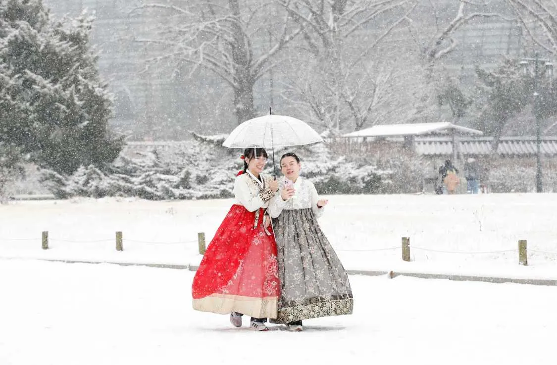 Foreign tourists wear hanbok, or traditional Korean dress, in Gyeongbok Palace in central Seoul on Dec. 30, 2023. [NEWS1]