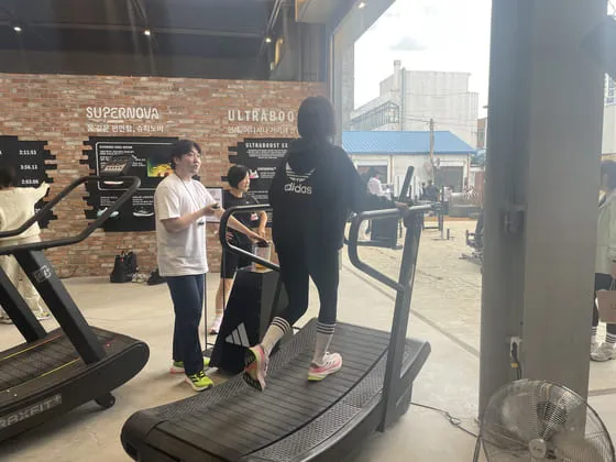 Adidas’s pop-up event “Adidas Ground Seongsu” on Oct. 3 in Seongsu-dong, eastern Seoul, invited visitors to don the brand’s shoes and run on a treadmill. The store, themed around training for track and field, displayed a variety of running shoes, targeting demographics from beginners to professional marathoners.