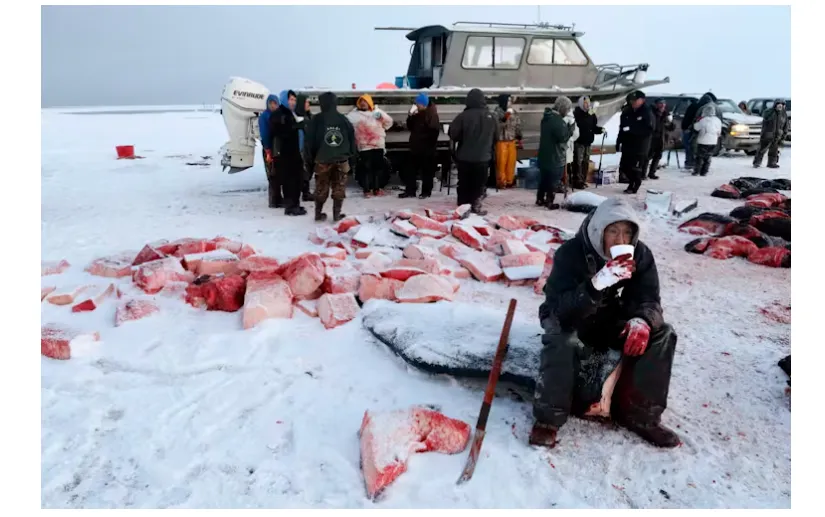 These patterns are consistent with historical records showing that commercial whalers primarily targeted bowhead whales. Surprisingly, narwhals in our study had much less genetic variation than bowhead whales. We thought bowhead whales, having endured more intensive exploitation, would have lower genetic diversity in the present day than narwhals, if both species began with similar levels of variation. A butcher takes a break while butchering a whale in a field near Barrow, Alaska in October 2014. (AP Photo/Gregory Bull)