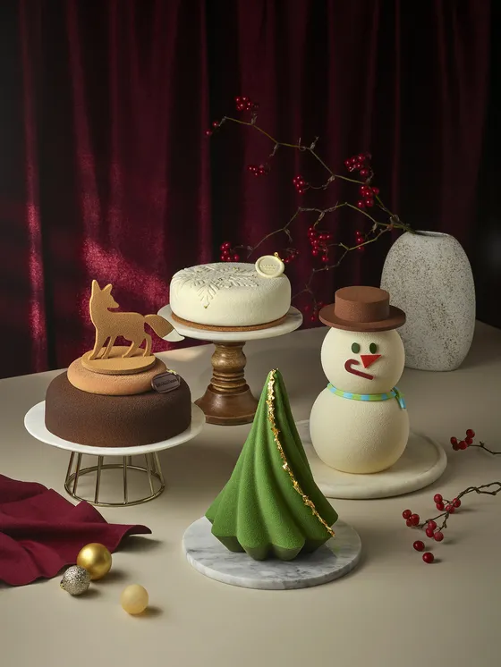 Christmas cakes at Conrad Seoul. Clockwise from top: Snow Flake yogurt mousse cake (80,000 won), Snowman cheesecake (110,000 won), Signiture Tree chocolate cake (95,000 won) and Renard caramel mousse cake (85,000won) baked with buckwheat.[CONRAD SEOUL]