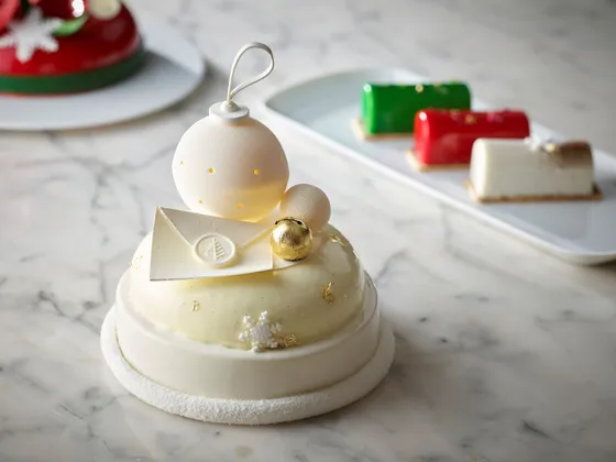In addition to the Crimson Noel Cake, Four Seasons offers the Winter Wonderland Cake (140,000 won). This two-layer mousse cake features pecan dacquoise, maple syrup, pear-infused mousse and caramel dulce ganache. It is topped with ornaments and a Four Seasons envelope crafted with white chocolate.
