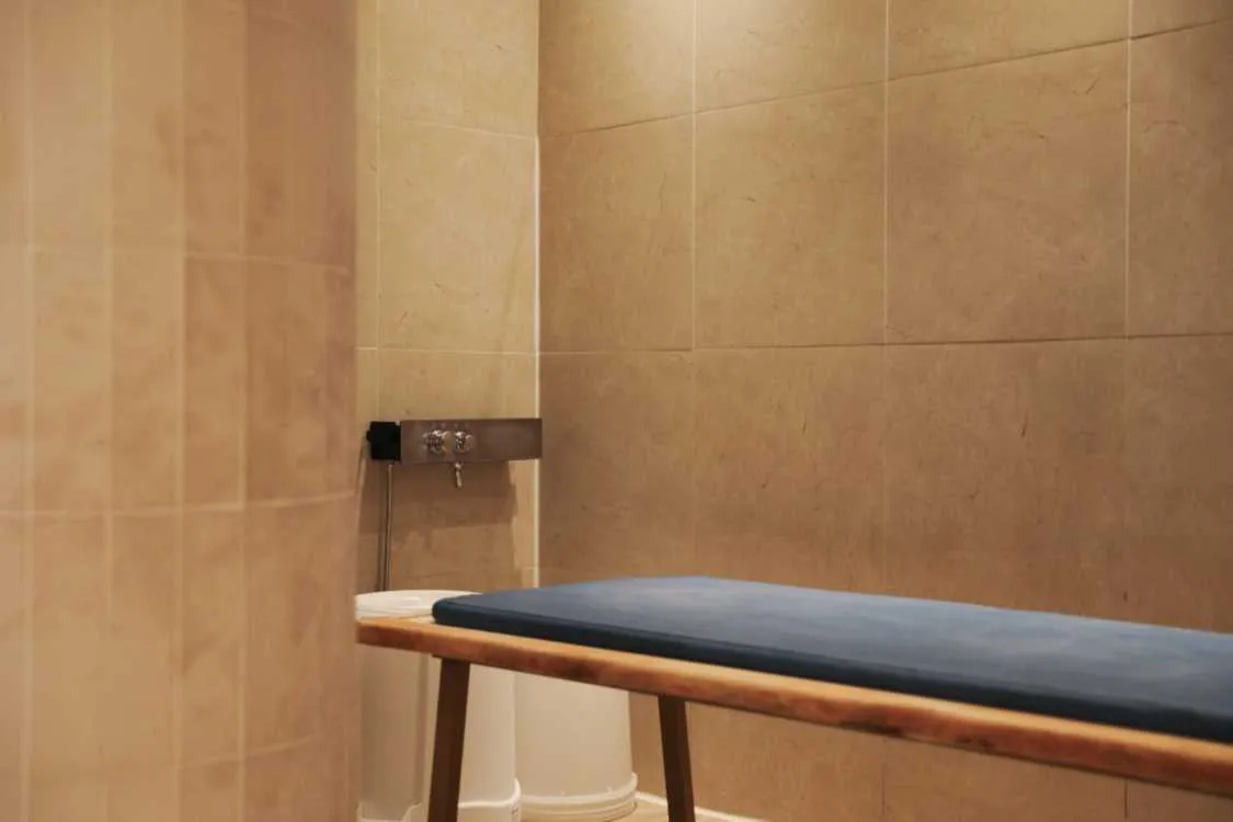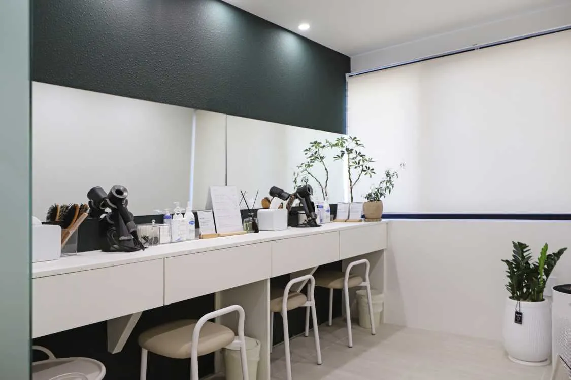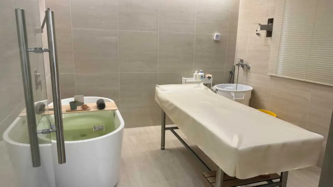 After the program ends, guests use a body dryer to dry and freshen up in the powder room, which is stocked with skincare products and a Dyson hair dryer. A cup of tea, prepared in advance, offers a final moment of quiet healing before stepping back into the day.