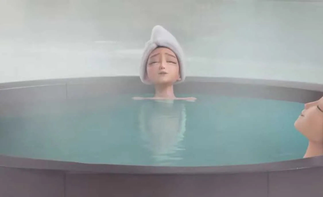 KPop Demon Hunters Rumi sinks into the bathhouse’s steaming waters. [SCREEN CAPTURE]