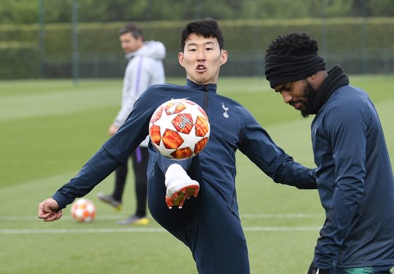 Tottenham Hotspur's Son Heung-min, left, attend a training session in London, Britain on April 29, 2019. [EPA/YONHAP]