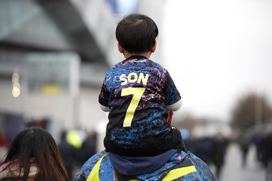 A young fan wears a shirt with the name and number of Tottenham Hotspur's Son Heung-min outside the stadium before a match between Tottenham Hotspur and Norwich City at Tottenham Hotspur Stadium in London on Dec. 5, 2021. [REUTERS/YONHAP]