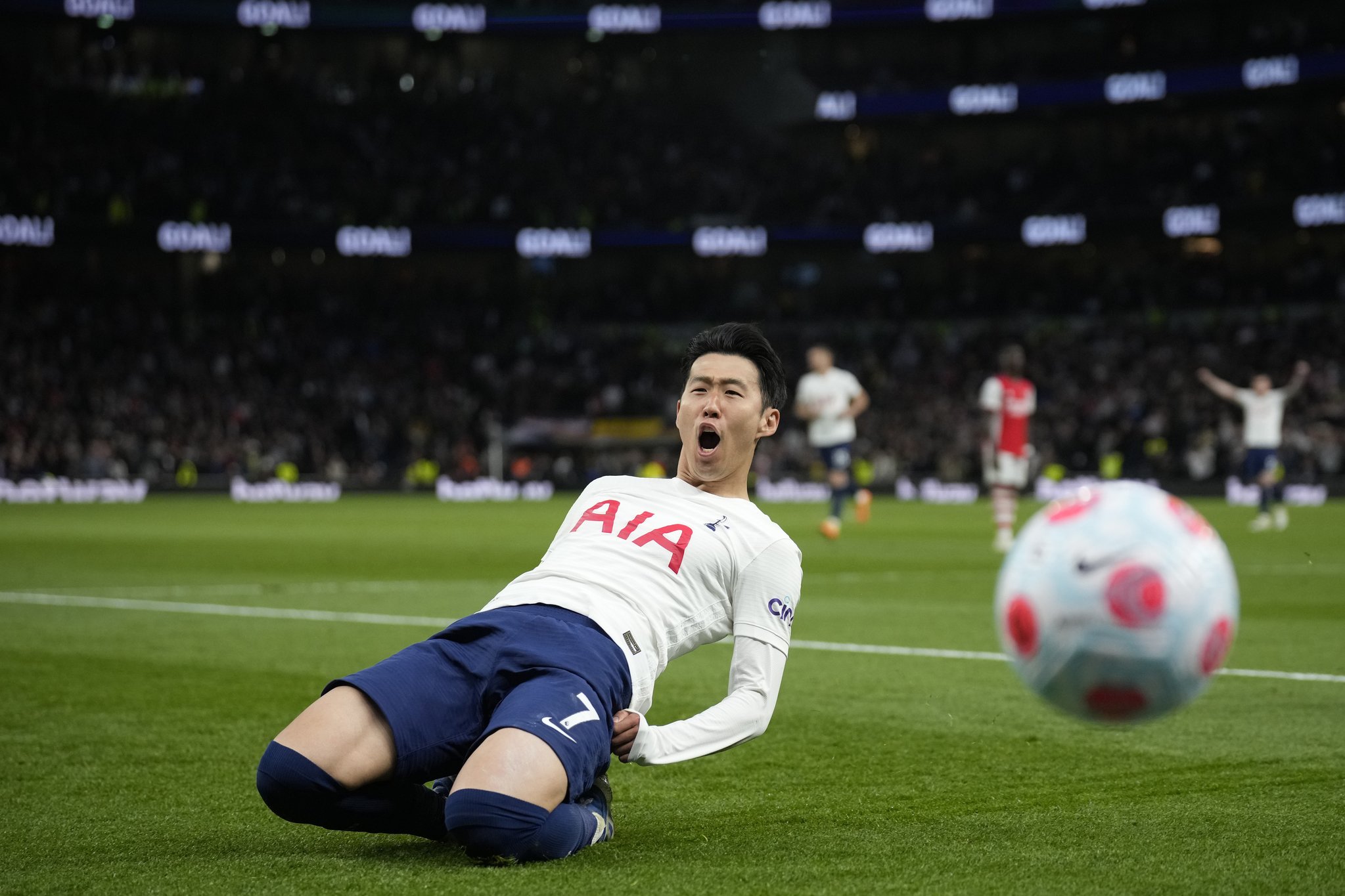 Tottenham's Son Heung-min celebrates after scoring against Arsenal during a Premier League match at Tottenham Hotspur stadium in London on May 12. [AP/YONHAP]