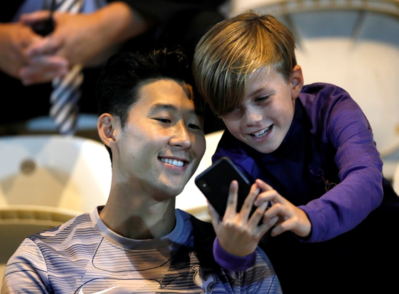 Tottenham Hotspur's Son Heung-min poses for a photo with a young fan at JobServe Community Stadium, Colchester in Britain on Sept. 24, 2019. [REUTERS/YONHAP]