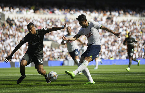 Tottenham Hotspur's Son Heung-min shoots with his left foot during a match against Southampton on Aug. 6 at Tottenham Hotspur Stadium, London, Britain. [REUTERS/YONHAP]