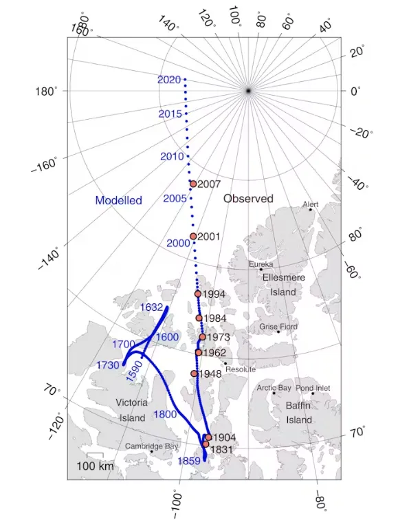 For most of the past 600 years, the pole has been wandering around over northern Canada. It was moving relatively slowly, around 6 to 9 miles per year, until around 1990, when its speed increased dramatically, up to 34 miles per year.