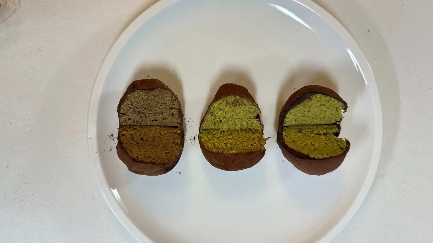 I shape a pistachio ball, which later resembles a small hedgehog after 25 minutes in the freezer. [WOO JI-WON]