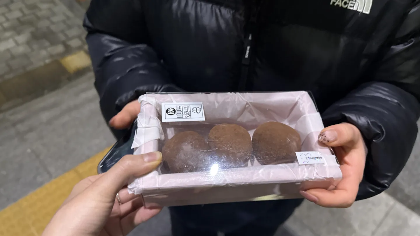 I gift three Dubai chewy cookies to a friend who biked 30 minutes at night to receive edible gold. [WOO JI-WON]