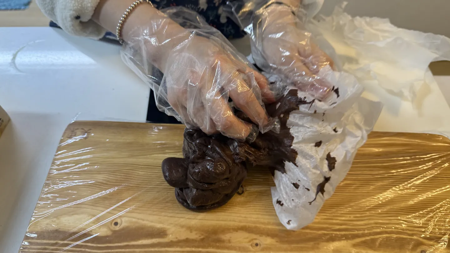 I then melted marshmallows and mixed them with cocoa powder to create a chewy chocolate marshmallow shell. This was the most fun part, by the way. I then placed it on parchment paper to cool. This later turned out to be a mistake — but more on that later.