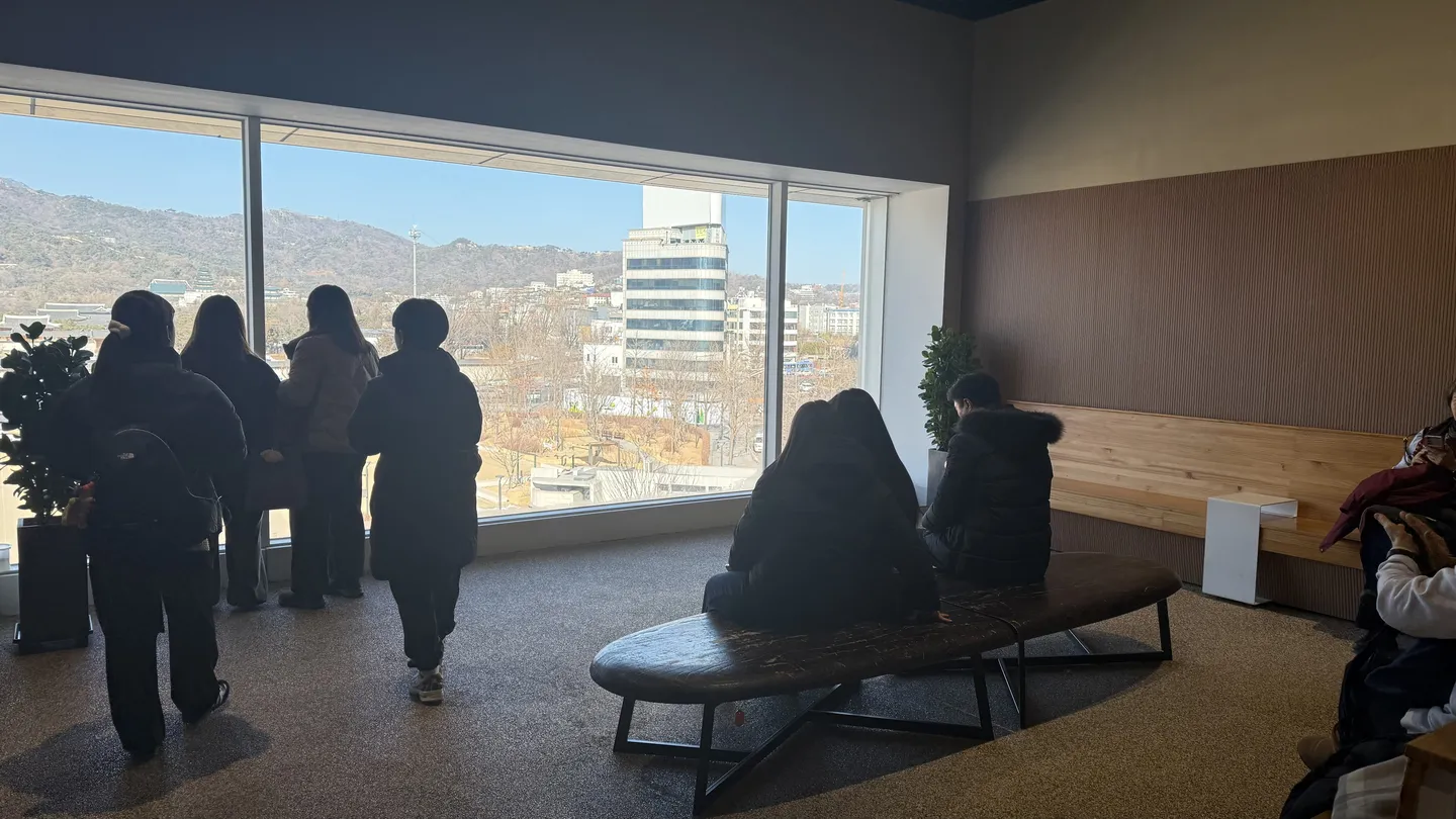After moving through the fifth-floor exhibition, which chronologically traces Korea’s history, visitors reach a small resting area with floor-to-ceiling windows overlooking the palace grounds.