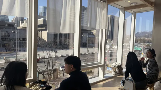 People are seated at the window seats on the third floor of the Starbucks Gwanghwamun branch.