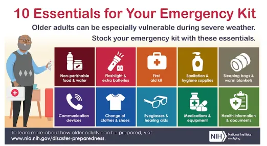 In addition to these basics, a winter emergency kit should have plenty of warm clothes and snacks to provide energy to produce body heat. National Institute of Aging