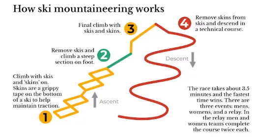 The sport requires competitors to ski uphill, transition to walking up steep climbs and then descend on skis.