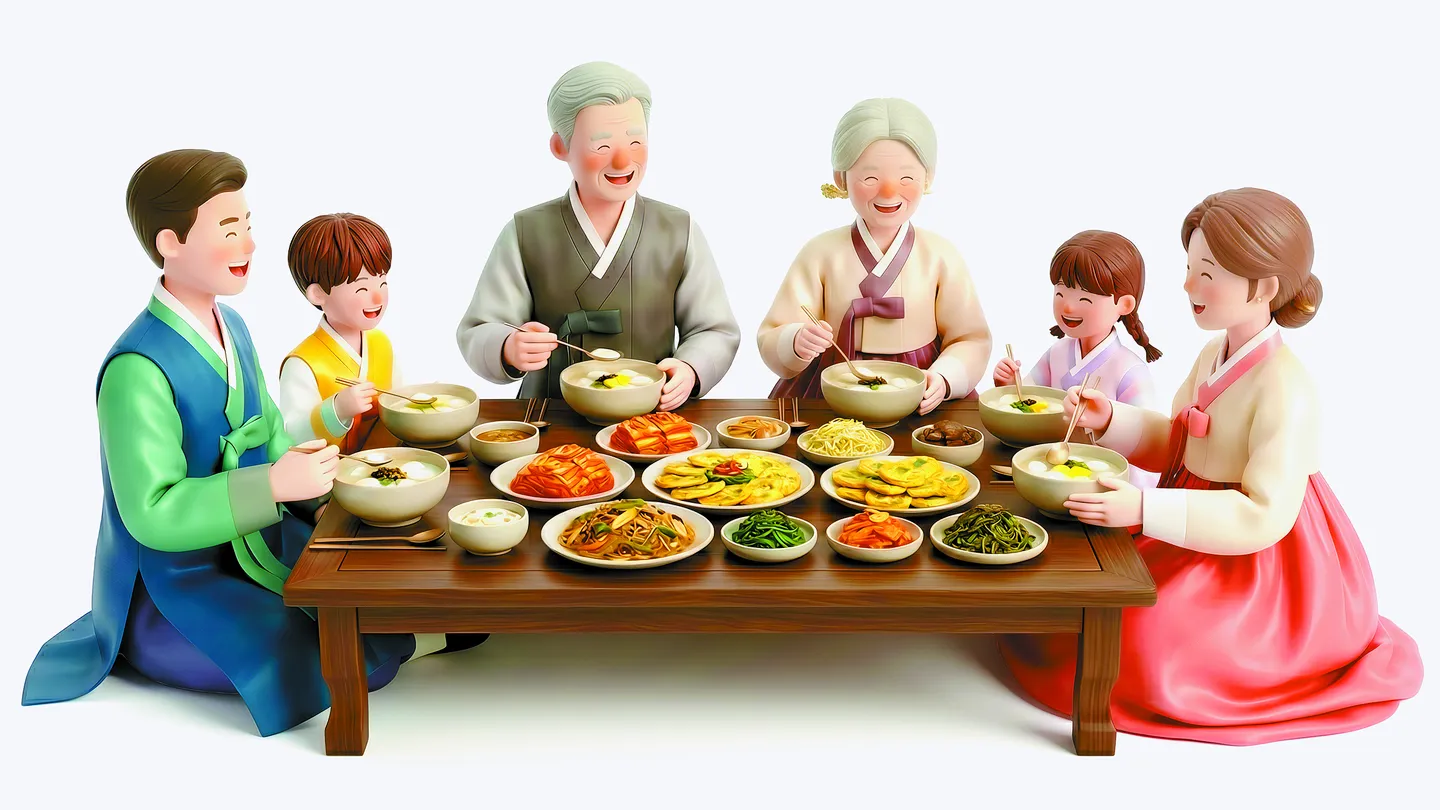 An image showing families dressed in hanbok (traditional Korean attire) having a holiday meal together [GETTY IMAGES BANK]