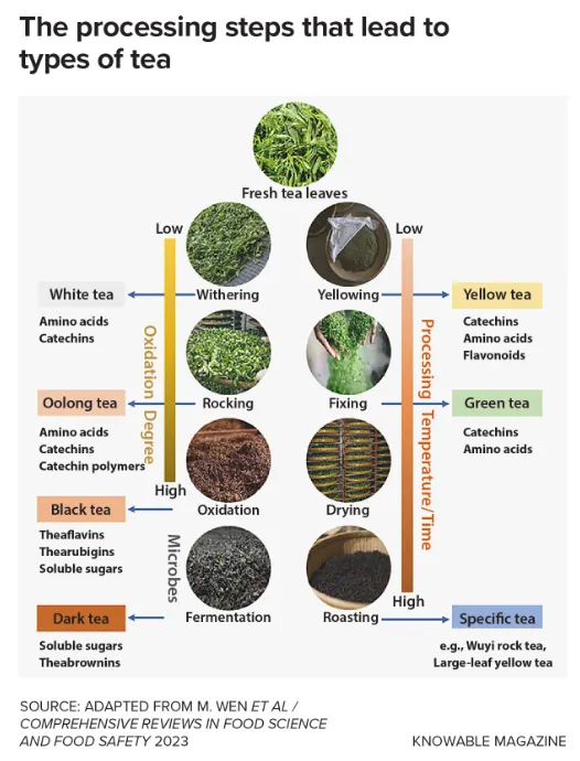 How tea-makers treat tea leaves yields a variety of types. Simple withering produces white tea; additional steps, including oxidation and fermentation, lead to several other varieties. Each step affects the compounds and sensory experience of the final product.