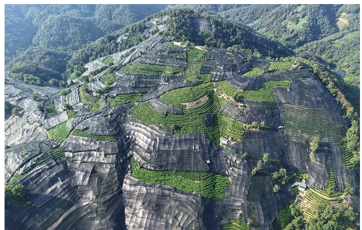 Shading tea protects some metabolites from molecular changes caused by sunlight. Shown above are shaded tea trees growing in Hangzhou, China, in a region known for West Lake Longjing or Dragon Well Tea. CREDIT: PHOTO BY COSTFOTO / NURPHOTO VIA GETTY IMAGES