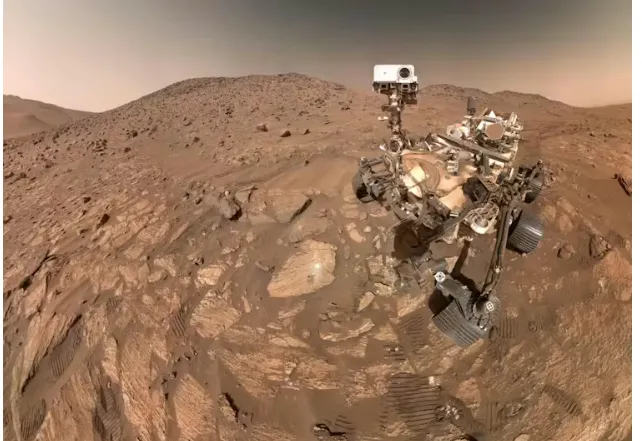 A selfie (made up of 62 images) taken by NASA’s Perseverance rover, against the backdrop of a rock called Cheyava Falls, which shows signs of possible signatures of previous organic life. (NASA/JLP-Caltech/MSSS)