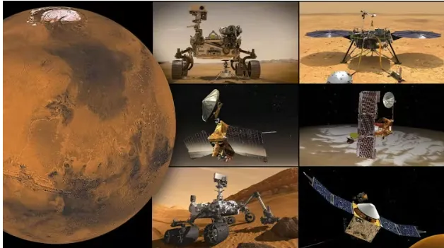 NASA’s Mars missions, clockwise from top left: Perseverance rover and Ingenuity Mars helicopter, InSight lander, Odyssey orbiter, MAVEN orbiter, Curiosity rover, and Mars Reconnaissance orbiter. (NASA/JPL-Caltech)
