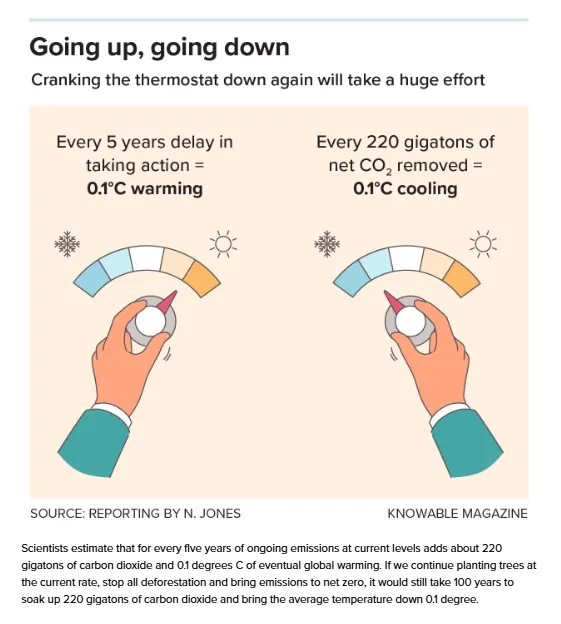 The effort needed to bring temperature back down again goes beyond the effort needed to hold global warming at a set target. The best estimate currently is that you need to remove a net of 220 gigatons of carbon dioxide from the atmosphere for every 0.1 degree Celsius of cooling.