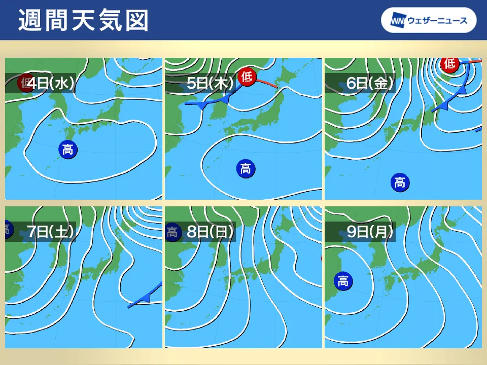 週間天気図5日(木)から6日(金)頃は、本州の南岸に天気図には描かれない前線が停滞し、太平洋側では雲が広がりやすく一部で雨が降る可能性があります。
