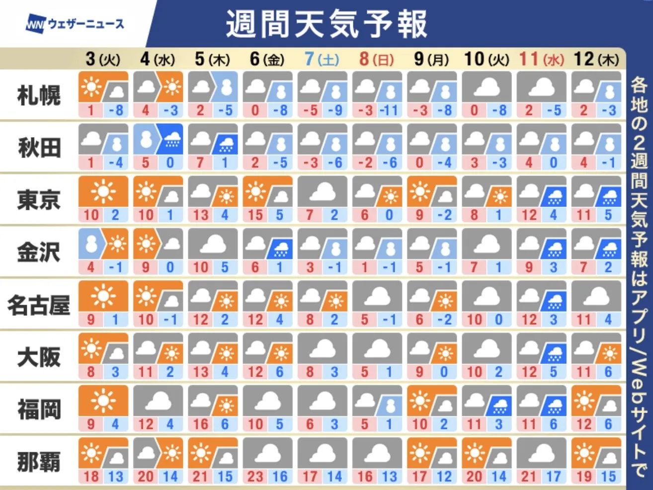 今日・明日〜2週間先までの週間天気予報