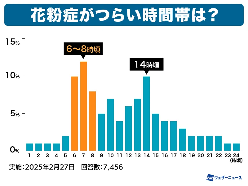 ウェザーニュースが会員向けに行った調査(花粉症の方のみ対象)で、「花粉症が最もつらい時間帯は?」と質問をしたところ、一番多かったのが朝7時頃でした。(2025年2月27日実施、参加者:7,456人)
