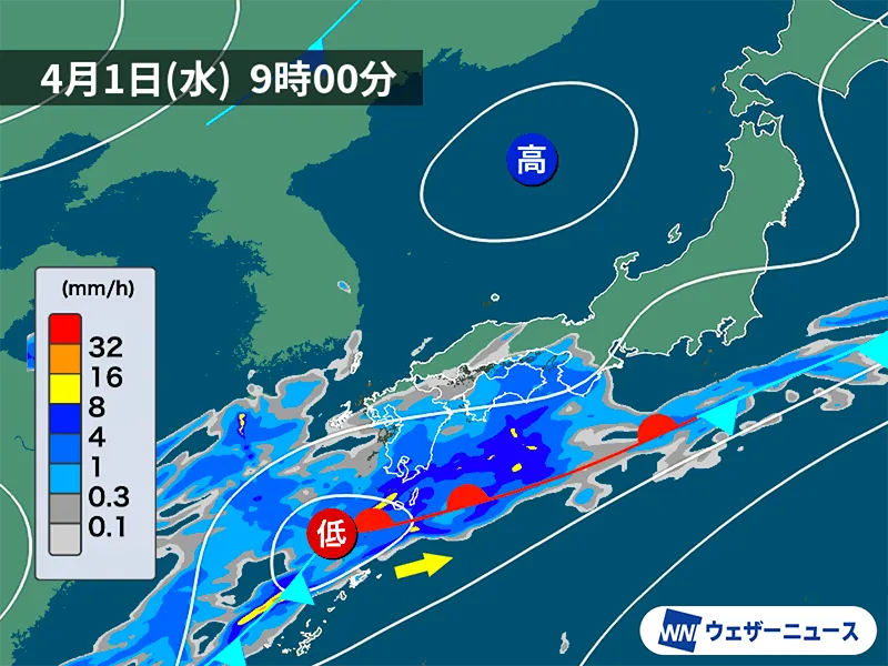 新年度スタートの今日4月1日(水)は低気圧が本州南岸を東進し、西日本や東日本の各地で雨の降る所が多くなります。朝は雨が降っていなくても傘をお忘れなく。自転車の方は傘さし運転をせずレインコートを。北海道は晴れて、昼間は過ごしやすい陽気になりそうです。