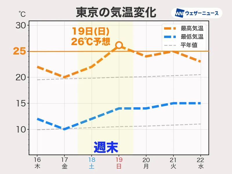 特に19日(日)から20日(月)頃は気温が上がり、東京や名古屋、大阪でも夏日に、東北南部でも30℃近くまで気温が上がるところがある見込みです。