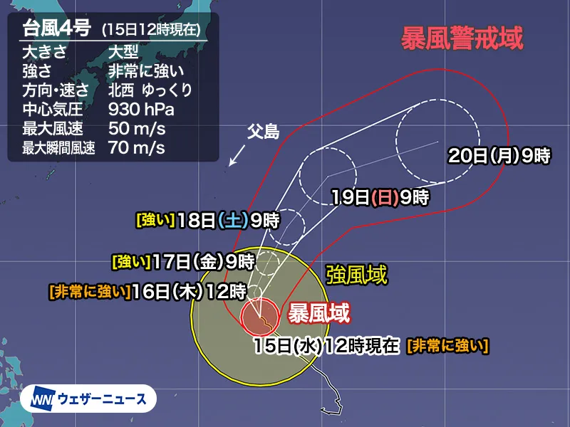 小笠原諸島を直撃する可能性は小さく、勢力は次第に弱まる予想ですが、16日(木)から18日(土)にかけてはうねりを伴った高波や強風に注意が必要です。こまめに最新の台風情報をご確認ください。