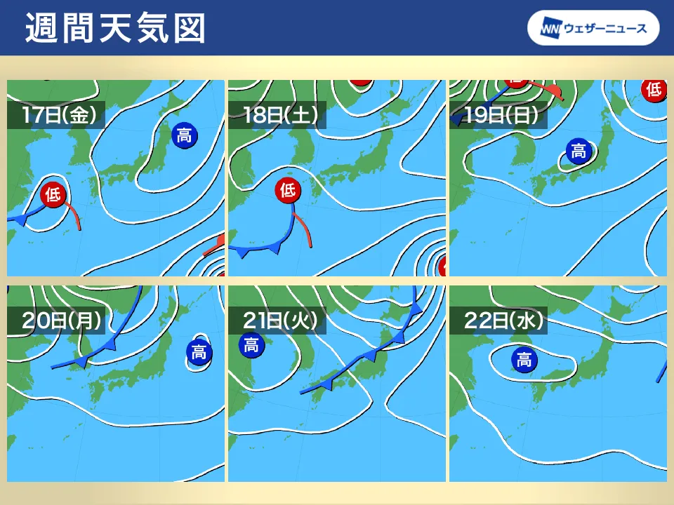 19日(日)から週明けにかけては高気圧に覆われて晴れる所が多くなるものの、21日(火)頃には再び前線の影響を受ける見込みです。