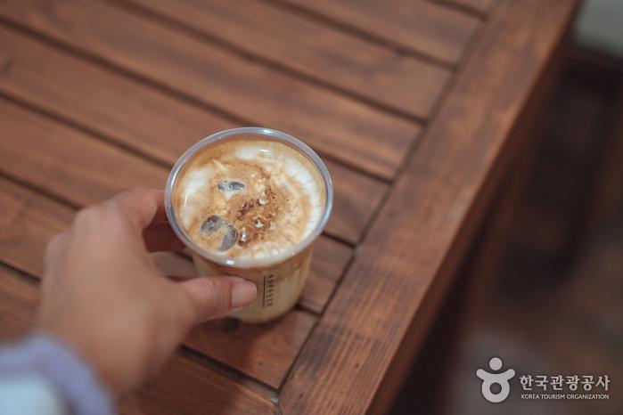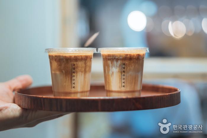 주문과 동시에 바로 만드는 초당 옥수수 커피초당 옥수수 커피는 흔들거나 섞지 않고 컵에 입을 댄 채 한 모금씩 마셔야 다양한 맛을 느낄 수 있다. 달콤한 초당옥수수크림과 고소한 우유, 갓 내린 에스프레소의 절묘한 조화가 꽤 잘 어울린다.