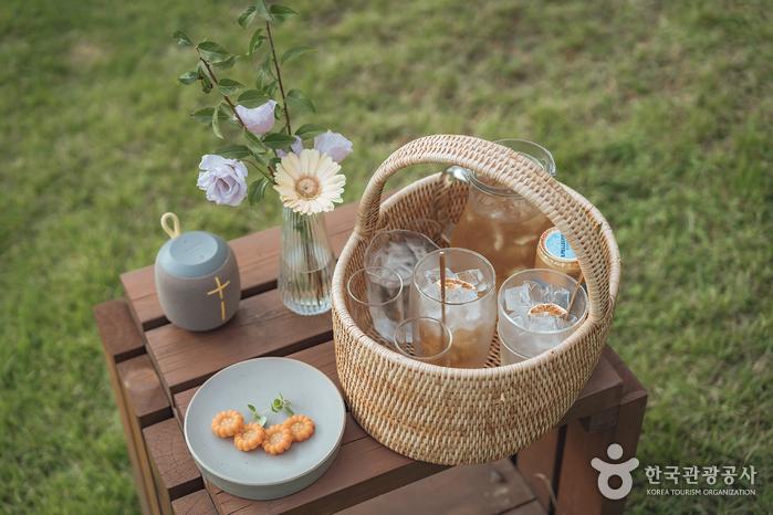 예약 시 선택 가능한 매실차와 콤부차 세트 르꼬따쥬의 공간은 한옥에 마당이 딸린 A존(2인 5만 원)과 B존(2인 4만 원), 오두막과 농장이 있는 C존(2인 4만 원) 세 곳으로 나뉜다. 어느 공간이든 인스타그래머블한 포토존이 가득해 사진 찍는 재미가 쏠쏠하다. 모든 공간은 100% 예약제로 운영되며, 시간대별로 한 팀씩만 입장 가능하다. 팀이 교체될 때마다 소독을 철저히 시행하니 조금은 마음이 놓인다.