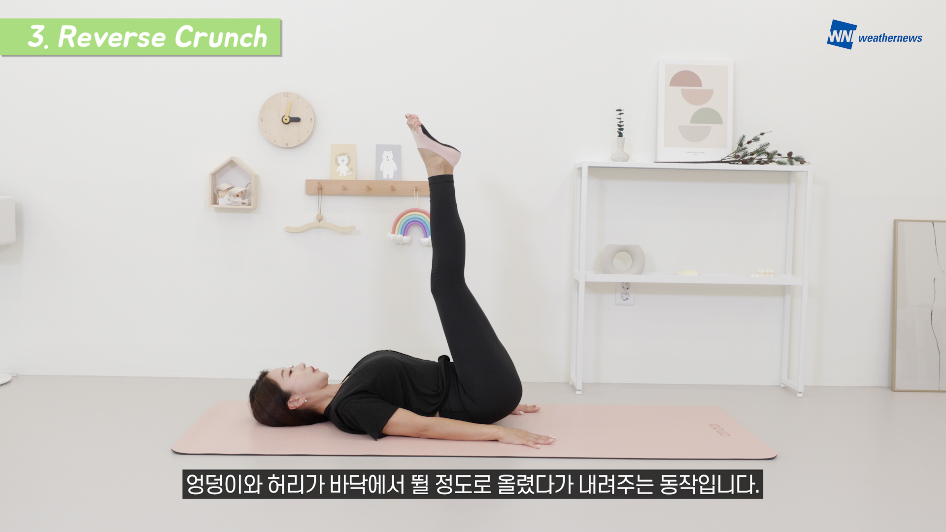 리버스 크런치는 단순히 다리만 들어올리는 상태가 아니라 엉덩이와 허리가 바닥에서 뜰 정도로 올렸다 내려주는 동작입니다. 복직근과 장요근, 외복사근 근육을 강화시키는데 효과적입니다.