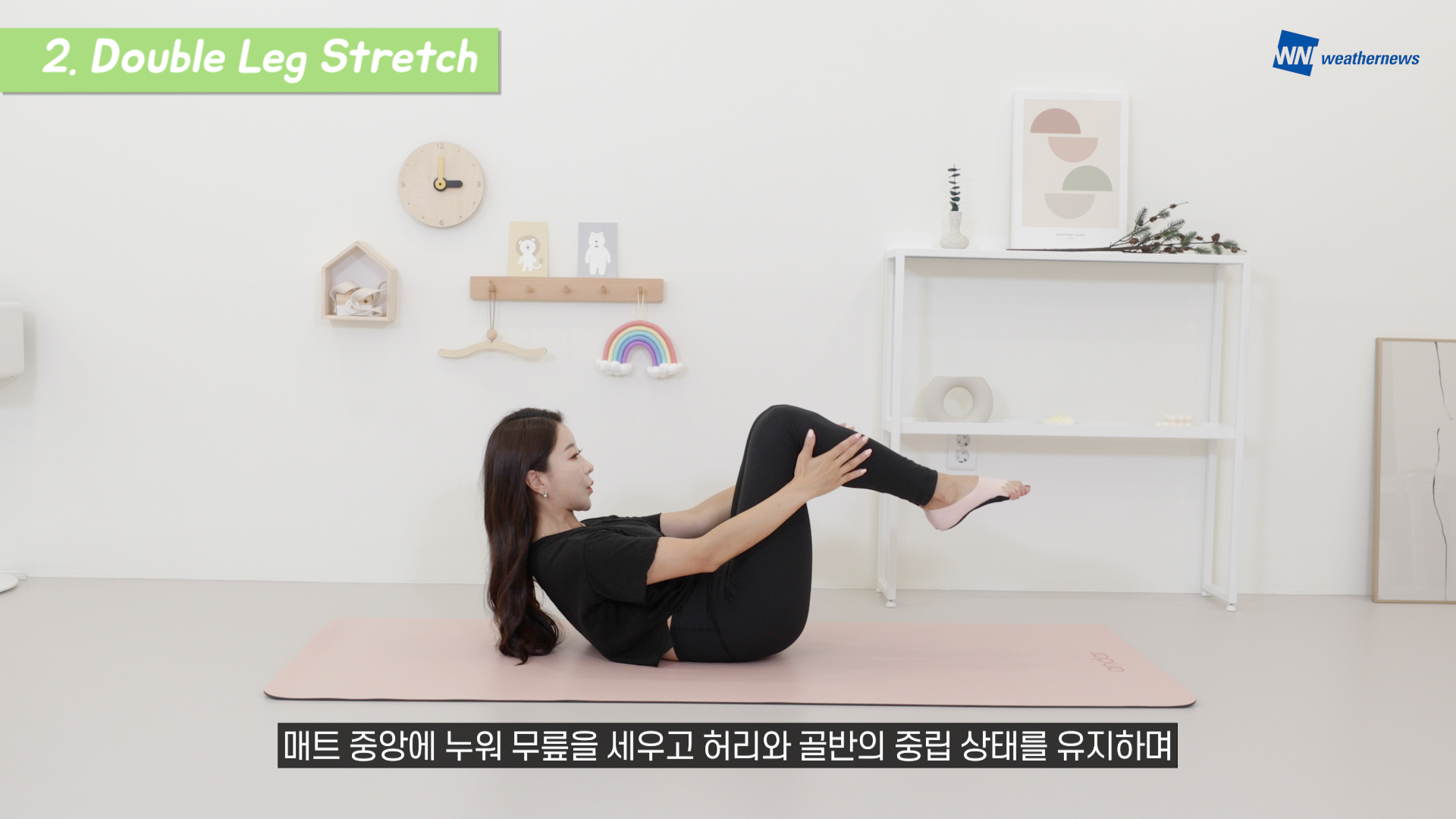 3) 마시며 천천히 복부 힘을 유지하며 다리를 원래 자세로 내려주시면 되는데요, 허리나 목, 반동의 힘을 쓰지 않고 배의 힘으로만 다리를 올려주셔야 합니다.
