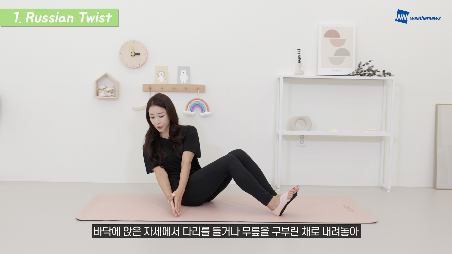 3) 트위스트 동작 중에 시선은 몸통을 따라가 주세요. 또, 손만 좌우로 돌리는 것이 아니라 배꼽을 중심으로 복부를 마치 빨래 짜듯이 비튼다는 느낌으로 진행해 줍니다.