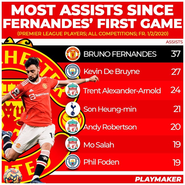 축구 통계 매체 ‘PLAYMAKER’는 21일(한국시간) 브루노 페르난데스가 맨체스터 유나이티드로 이적한 뒤에 EPL 도움 순위를 정리해 발표했다.
