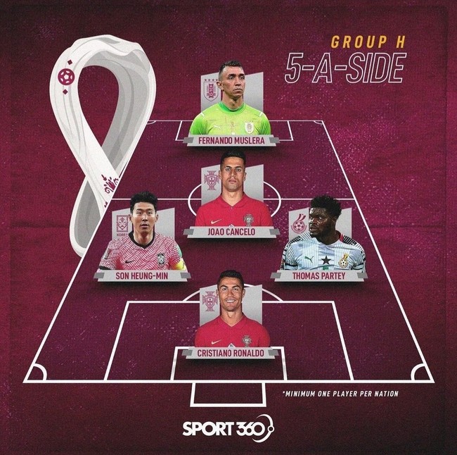 글로벌 매체 ‘스포츠360’은 2일(한국시간) 2022 국제축구연맹(FIFA) 카타르 월드컵 조 추첨 이후, 각 조를 대표하는 최고의 선수들을 꼽아 5인 포메이션을 만들었다. 대한민국이 속한 H조는 포르투갈-우루과이-가나와 함께하게 됐다.