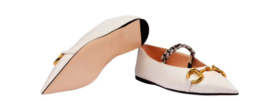 맑은 날씨 때문인지 화이트 레더가 눈길을 끈다. 뾰족코의 레더 플랫. 매크로 버전의 홀스빗과 실버 톤 체인이 달렸다. 접어 신을 수 있는 힐 형태로 고급스럽고 편안하다.