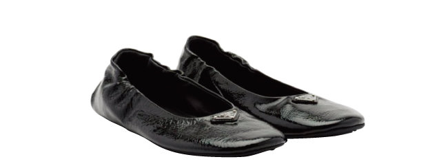 곧 죽어도 블랙만 고집하는 이들을 위해 준비한 프라다의 발레리나 플랫. 스퀘어 형식의 뭉툭한 앞코가 특징. 에나멜 메탈 트라이앵글 로고가 군더더기 없는 디자인을 완성했다. 어떤 룩에도 코디하기 쉽다.