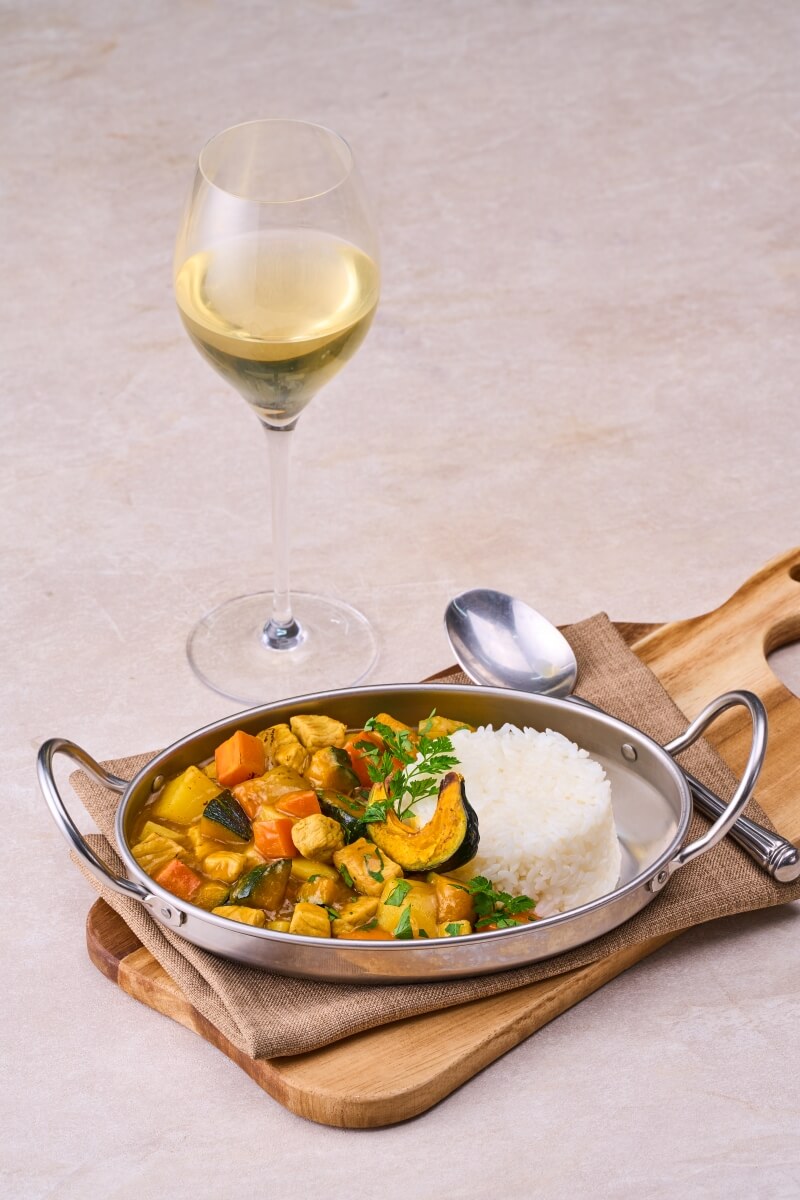 Pairing Point_ 미국산 비오니에는 산미가 있는 음식과도 잘 어울린다. 특히 워싱틴에서 생산된 비오니에는 캘리포니아산보다 더 산도가 높고 바디감이 가벼운 편이다. 미국산 돼지고기를 사용한 카레와 매칭하면 비오니에의 산미가 향신료 향과 돼지고기를 부드럽게 만들어 주고 채소의 풍미는 한층 풍부하게 해준다.