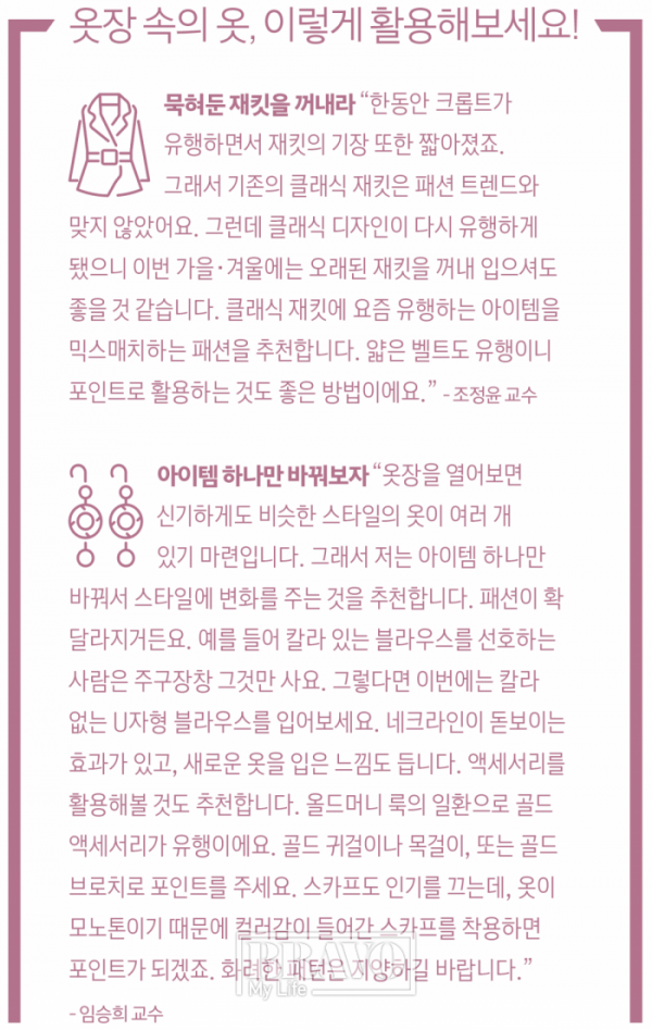 마지막으로 임승희 교수는 ‘옷 잘 입는 시니어’가 되기 위해선 ‘많이 보고, 많이 입어보라’고 조언했다. 20년 넘게 스타일리스트로 일하고 있는 임 교수가 실제로 느낀 옷 잘 입는 연예인들의 비결이다. “연예인이라고 처음부터 옷을 잘 입는 것은 아니다. 방송 활동을 하면서 옷을 많이 입어보고 자신의 스타일을 찾아가는 과정을 겪는다”고 설명을 덧붙였다.