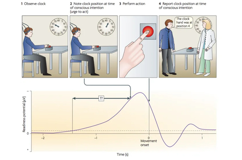 1980년, 미 캘리포니아의 심리학자인 벤자민 리벳(Benjamin Libet)은 실험 참가자들에게 근육과 뇌파의 움직임을 측정하는 기구를 부착시킨 뒤 맘이 내킬 때 언제든 앞에 놓인 버튼을 누르라 지시했다. 그리고 버튼을 눌러야겠다고 결정한 순간의 정확한 시간을 기억해 함께 보고하도록 요청했다.