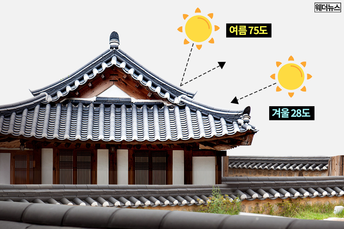 여름철의 뜨거운 햇빛은 처마의 돌출 각도로 인해 막을 수 있어서 더위를 피할 수 있고, 또 겨울에는 햇빛이 낮은 각도로 완만하게 비치는 점을 이용해 겨울에는 햇빛이 오래 머물러 집안에 온기가 들어올 수 있습니다.