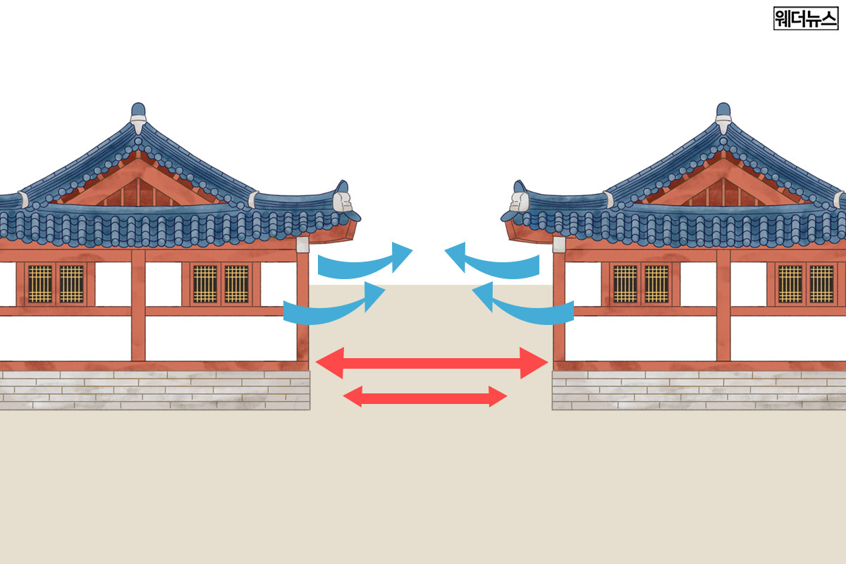 두 건물을 비스듬하게 보면 바람이 통과하는 길의 양쪽 간격이 다른 것을 볼 수 있는데요, 보통 남쪽이 넓고 북쪽이 좁게 만들어져 있습니다.