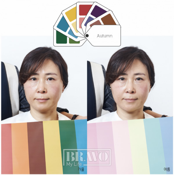 모델 최진희 씨는 진단 결과 가을 딥 웜 톤이 나왔다. 최희선 대표는 “웜 톤은 잘 어울리는 색을 매치하면 혈색이 더해져 피부가 건강해 보이지만 어울리지 않는 색을 쓰면 칙칙하고 피곤해 보인다. 쿨 톤은 혈색이 빠지면서 투명하고 깨끗한 이미지가 살아나고, 어울리지 않는 색은 핼쑥해 보일 수 있다”고 설명했다.