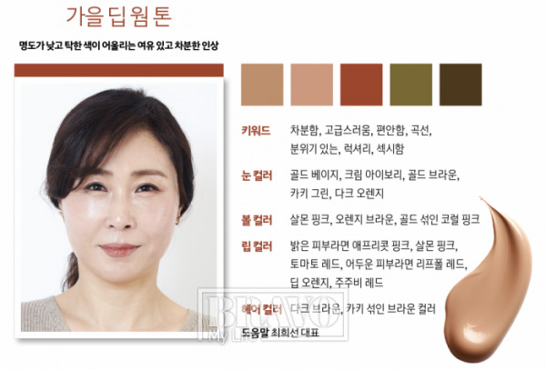 최희선 대표 코멘트 ▶ 가을 딥 웜 톤은 명품에서 주로 사용하는 색을 참고하면 좋다. 스트라이프 무늬가 있는 옷이나 칼단발, 생머리보다는 곡선을 활용한 옷이나 웨이브가 있는 머리 스타일이 어울린다. 클래식한 스타일링이 어울리고 헤어는 브라운 계열, 섀도는 골드 베이지나 샴페인 골드 등이 어울릴 것.