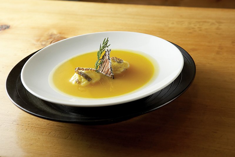 1 준비된 생수에 닦은 다시마를 넣고 부르르 끓으면 가츠오부시를 넣고 불을 끄고 약 20분간 그냥 둔다. 2 껍질을 벗긴 단호박을 끓는 물에 넣고 익을 때까지 삶는다(소금을 약간 넣어 색과 맛이 빠지는 걸 막아준다). 3 2의 삶은 단호박을 고운 체에 내린다. 4 도미살은 2mm 두께로 포를 떠서 다시 얇게 채썬다. 5 달걀노른자에 식용유를 넣고 마요네즈 농도로 될 때까지 젓다가 짜지 않게 소금으로 간한다. 6 5와 4를 같이 버무린 후 쿠킹 랩을 깔고 버무린 도미살을 펴고 그 위에 게살을 얹는다. 랩을 김밥 말 듯 동그랗게 말아준다. 실이나 고무줄로 고정시켜 안 풀어지게 한 후 끓는 물에 약 5분간 익힌다. 7 1을 고운 헝겊에 찌꺼기 없이 거른 다음 다시마 우린 물에 3을 넣고 은근한 불로 끓인다. 8 7이 끓을 무렵 칡 녹말과 물을 섞어 넣고(꼭 칡 녹말이 아니어도 된다) 끈기가 있을 정도로 농도를 맞춘 후 소금과 국간장으로 가볍게 간을 한다. 9 수프 접시에 6을 넣고 잠기지 않을 정도로 8을 붓는다. 10 살짝 데친 도미껍질과 로즈메리, 도미 지느러미로 보기 좋게 모양을 낸다.